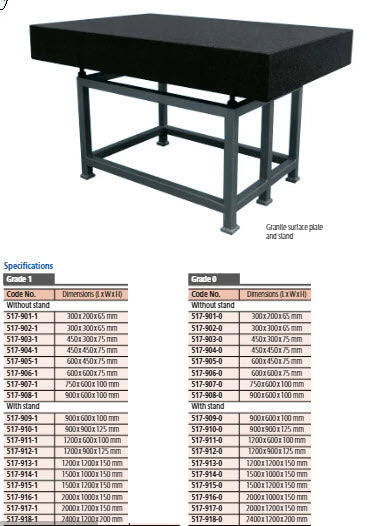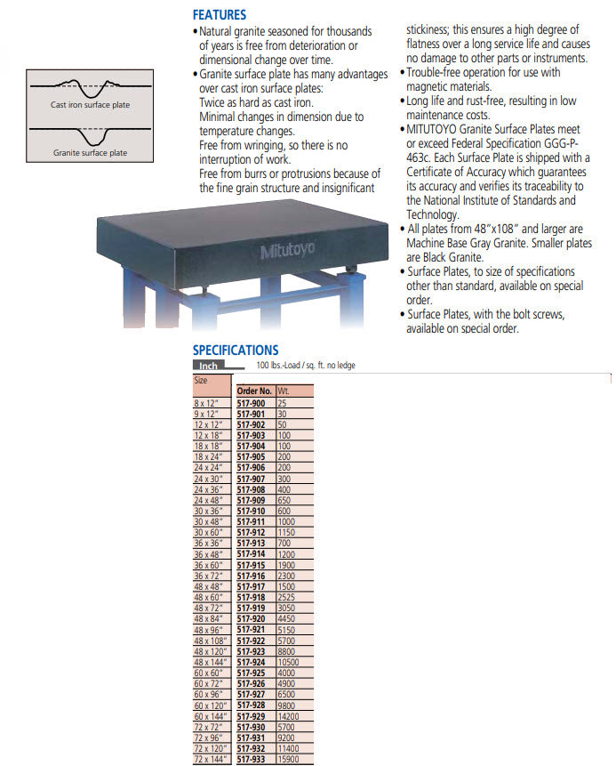 A Mitutoyo surface plate made from fine-grained black granite. This material has many advantages compared to cast iron in this application, such as being non-magnetic, rustless, twice as hard, non-burr-forming and not prone to stickiness.