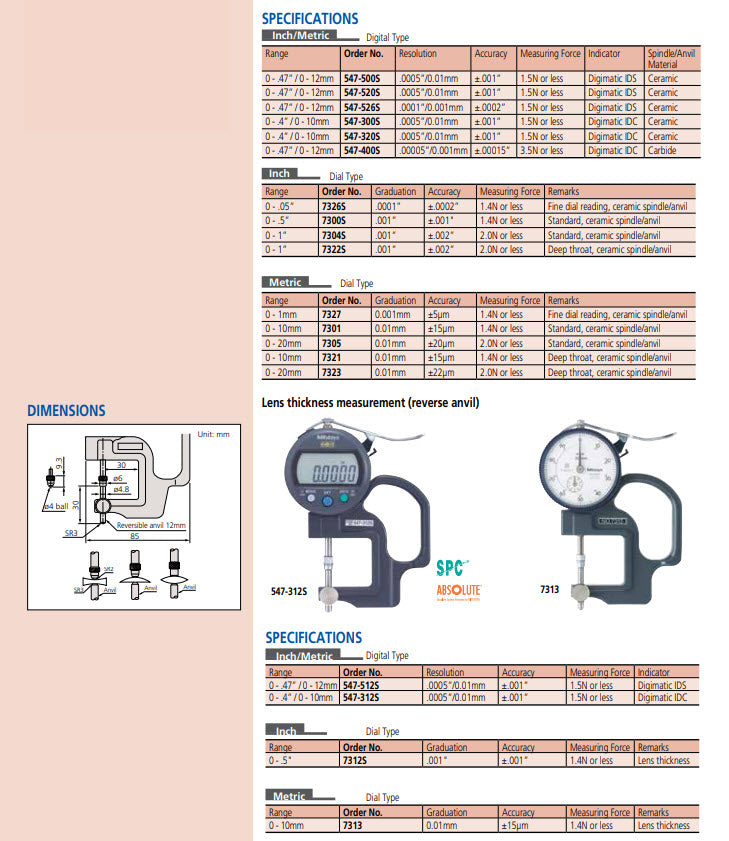 A Mitutoyo digital-indicator based instrument designed for quick and efficient measurement of small dimensions. Ideally suited for measuring the thickness of paper, film, wire, sheet metal and similar materials. The convenient grip handle, thumb trigger and spring-loaded plunger make the instrument easy to use.