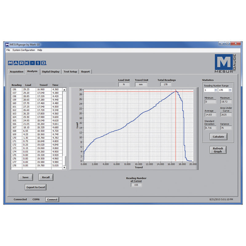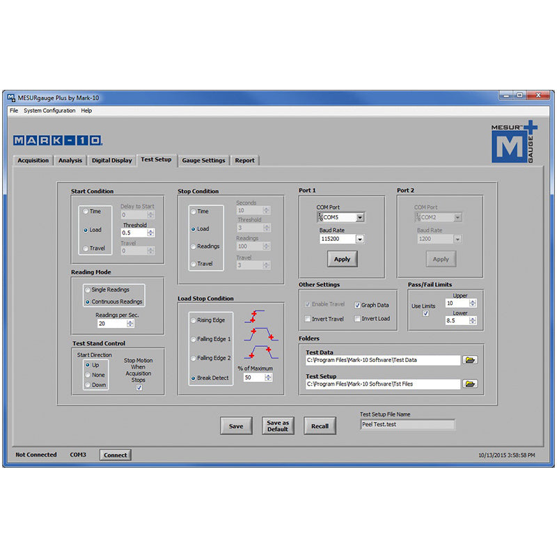 The program includes a set of tools to analyze test results, including statistical calculations, quick data export to Microsoft Excel, customizable reports, pass/fail indicators, and many others. Test setups are customizable and can be saved and recalled. The user can program test start and stop conditions, including load, time, distance, and sample break. Additional features include a large display screen for real time load and travel data and a utility to configure certain Mark-10 gauges from a PC.