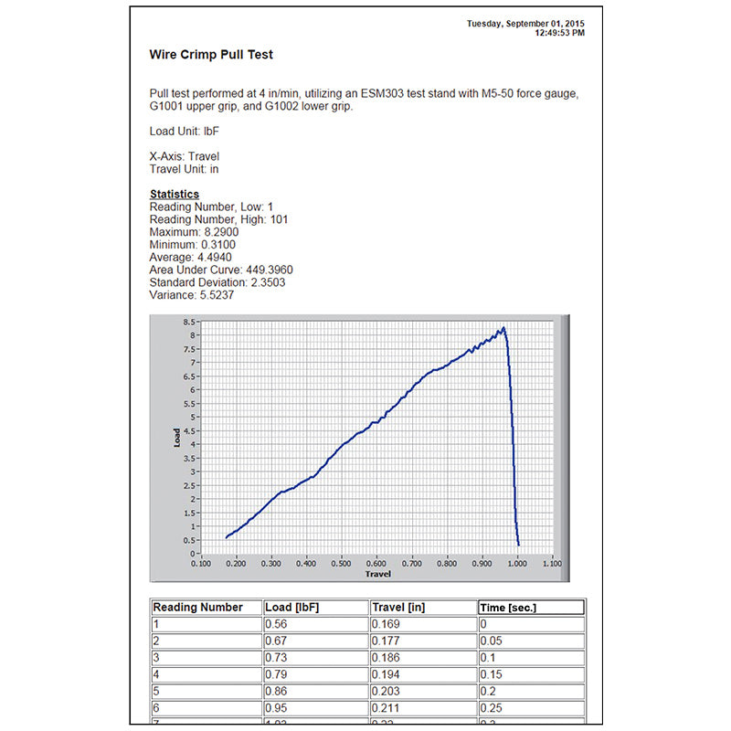 MESUR®gauge Plus expands the functionality of force and torque measuring instruments and test stands. MESUR®gauge Plus has the ability to capture and display data in graphical format for load vs. time or load vs. travel vs. time and adds the ability to control the motion of certain Mark-10 motorized test stands, coordinating motion control and data acquisition.