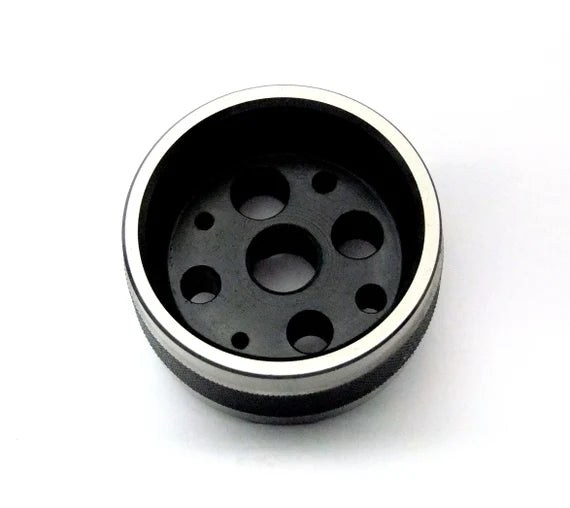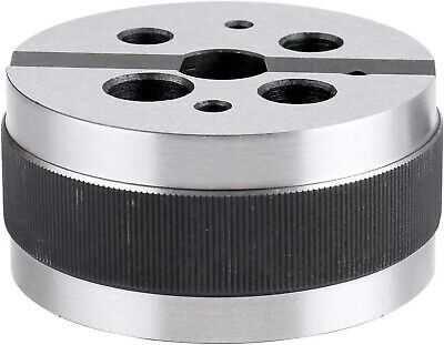 Very handy for holding work when driving pins, drilling, etc. V-groove across face accommodates round & odd shaped stock. Smooth finish on the face preserves the work being held. Hardened and ground. Block is approximately 3" diameter and 1 1/2" high. Holes vary in sizes from 1/8" to 5/8".