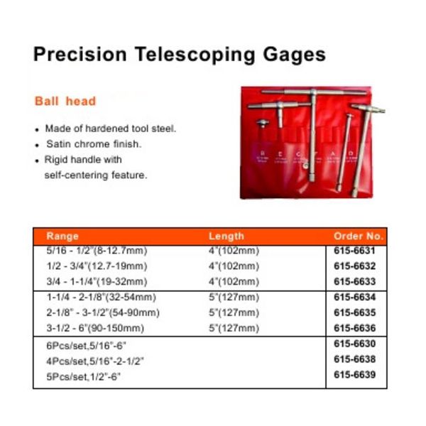 Telescoping Gauges Used for comparative measurement of bore diameter and groove width -Spring loaded plunger expands within the hole whilst knurled clamp allows contacts to be locked in position then removed and measured using a micrometer or caliper -Available individually or as a set in a plastic wallet