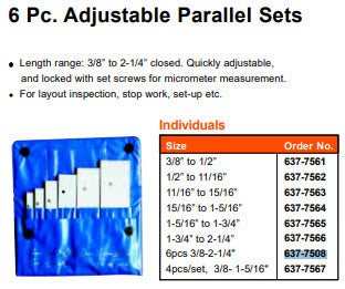 MHC 637-7508 Adjustable Parallels Description : Set of 6 Adjustable Parallels Sizes : 3/8-1/2", 1/2-11/16", 11/16-15/16", 15/16-1-5/16" 1-5/16-1-3/4", 1-3/4-2-1/4"