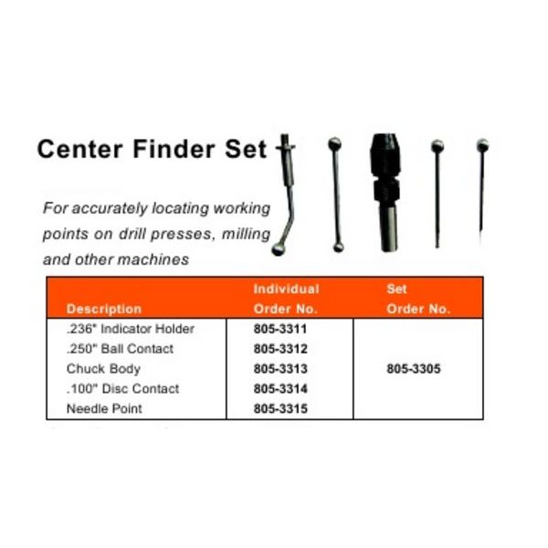 MHC 805-3305 Center Finder Set 5 pieces, one of .236" holder, .250" ball, .100" Disc & Needle point