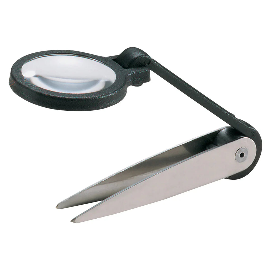 This tweezer magnifier is useful for detailed projects. The unit has a 5-power lens, stainless steel tweezer and double hinged adjustable arm. Made with a durable plastic handle and frame with a fine tip. Tweezer length 2-1/4".