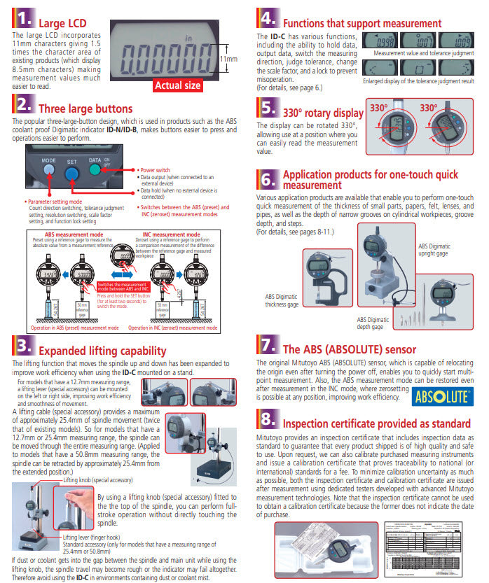 A digital indicator of similar size to a Series 2 type dial indicator. ABSOLUTE System scale for error free, high-speed measurement. Functionality includes displaying the result of an internal calculation based on spindle displacement, according to a single-term user-defined formula (Ax), and tolerance judgement. SPC data output.