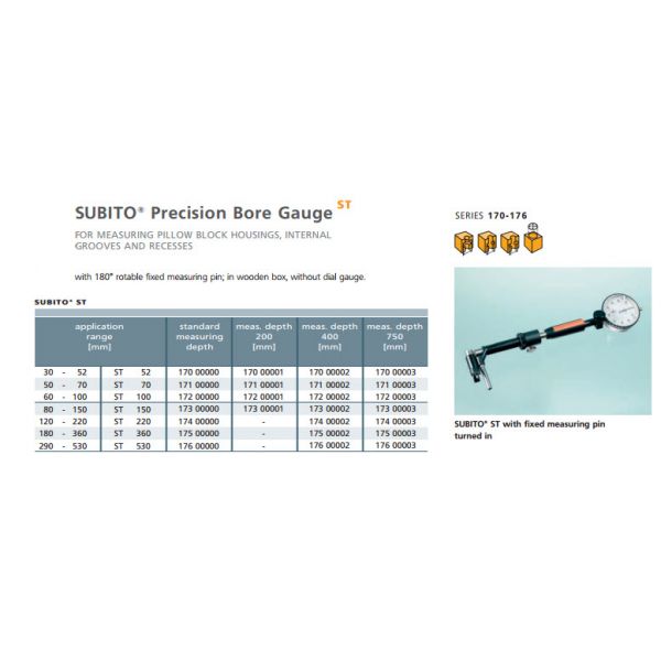 SUBITO® Precision Bore Gauge ST FOR MEASURING PILLOW BLOCK HOUSINGS, INTERNAL GROOVES AND RECESSES. with 180° rotable fixed measuring pin; in wooden box, without dial gauge.