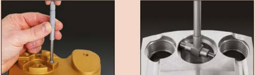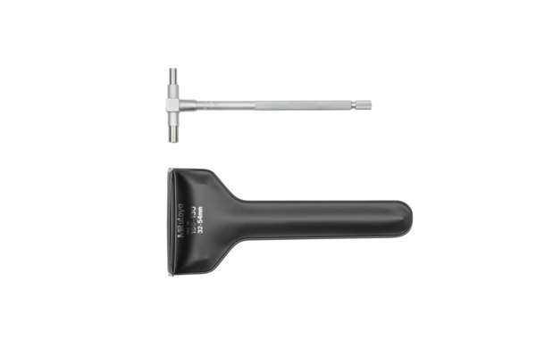 A Mitutoyo transfer gauge that enables the diameter of holes, bores or grooves to be measured with outside micrometers or calipers. In operation the spring loaded plunger is allowed to expand within the feature to be measured and then locked in place using the knurled rotary control on the end of the handle. In practice some manipulation is necessary to ensure that the minimum size has been captured, after which the gauge is carefully withdrawn so that the dimension across the contact surfaces can be measured.